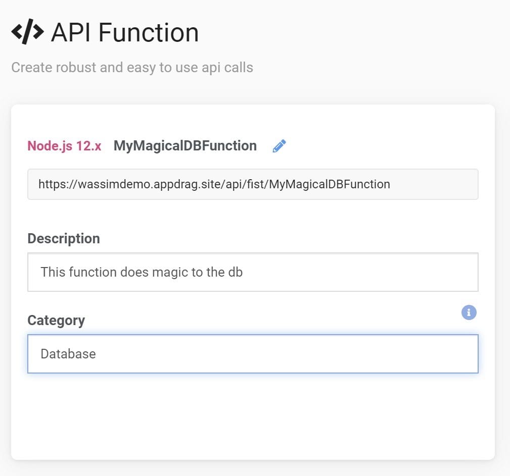 When you have essential functions you reuse accross different projects it is convenient to have them available for new function creation. We made it available by defining a category to your API function.